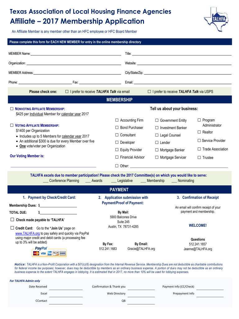 Texas Association of Local Housing Finance AgenciesAffiliate 2017 Membership Application An Affiliate Member is any member other than an HFC employee or HFC Board Member Please complete this form