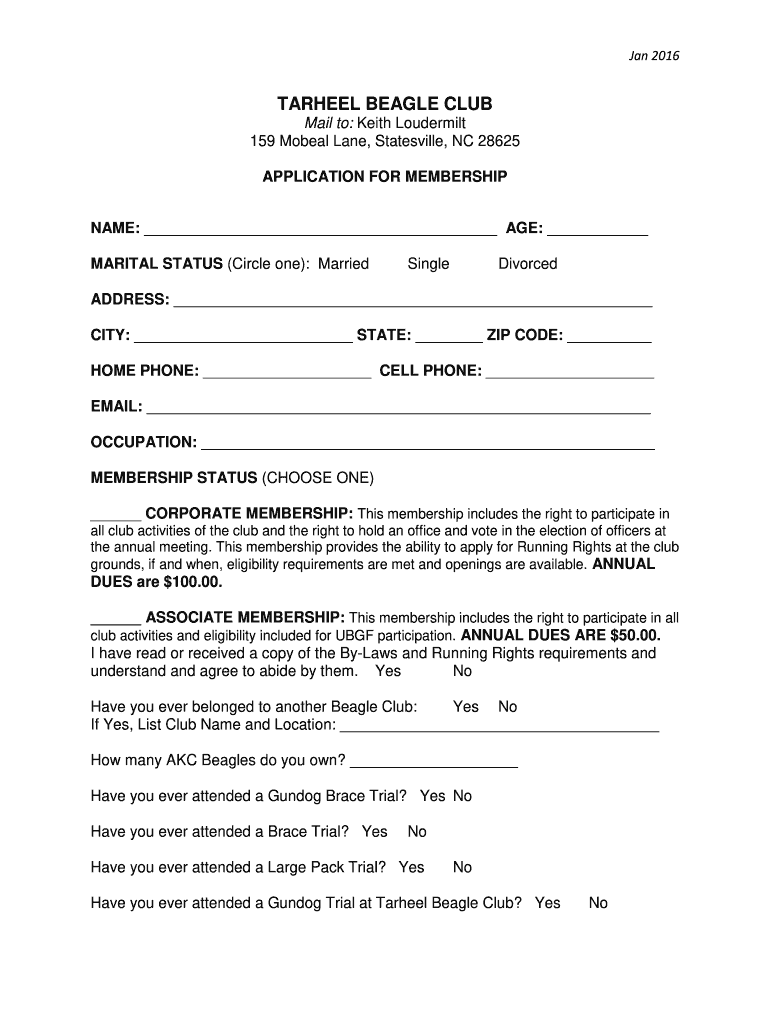 Jan 2016TARHEEL BEAGLE CLUB Mail to: Keith Louder milt 159 Model Lane, Batesville, NC 28625 APPLICATION FOR MEMBERSHIP NAME: AGE: MARITAL STATUS (Circle one): MarriedSingleDivorcedADDRESS: CITY: STATE: