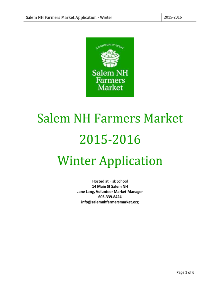 Salem NH Farmers Market Application Winter20152016Salem NH Farmers Market 20152016 Winter Application Hosted at Fisk School 14 Main St Salem NH Jane Lang, Volunteer Market Manager 6033398424 info
