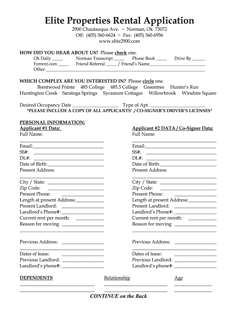 Elite Properties Rental Application 2900 Chautauqua Ave. Norman, Ok 73072 Off: (405) 3606624 Fax: (405) 3606956 www.elite2900.com HOW DID YOU HEAR ABOUT US? Please check one. Ok Daily Norman Transcript