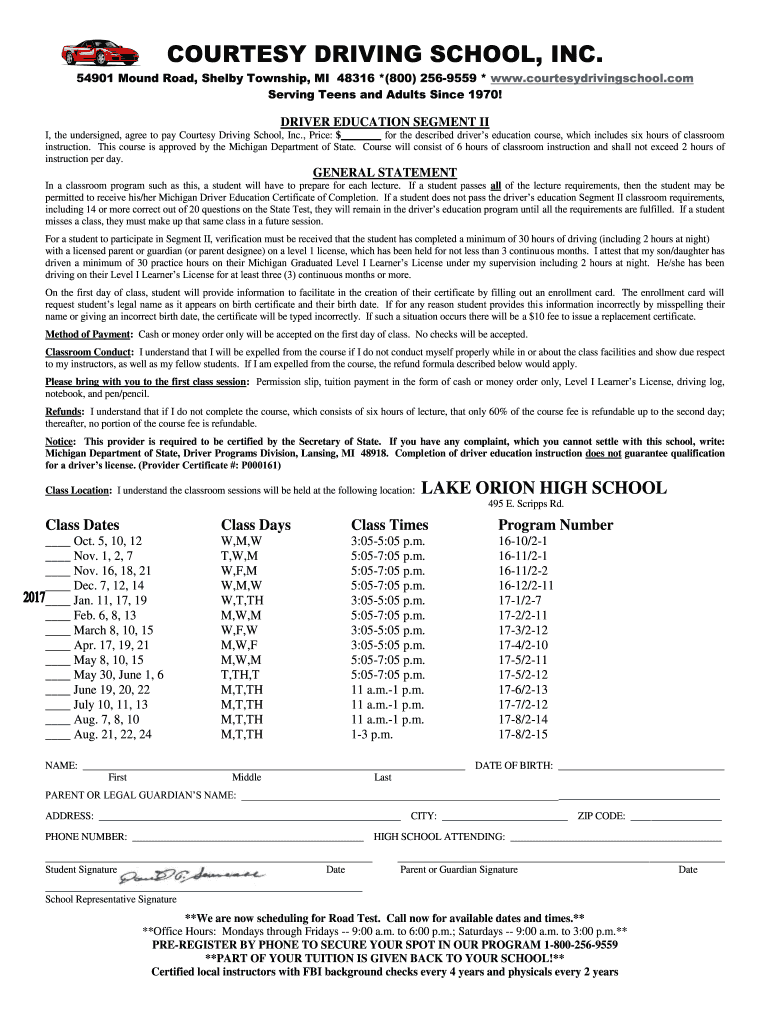 COURTESY DRIVING SCHOOL, INC. 54901 Mound Road, Shelby Township, MI 48316 *(800) 2569559 * www.courtesydrivingschool.com Serving Teens and Adults Since 1970!DRIVER EDUCATION SEGMENT II I, the undersigned,