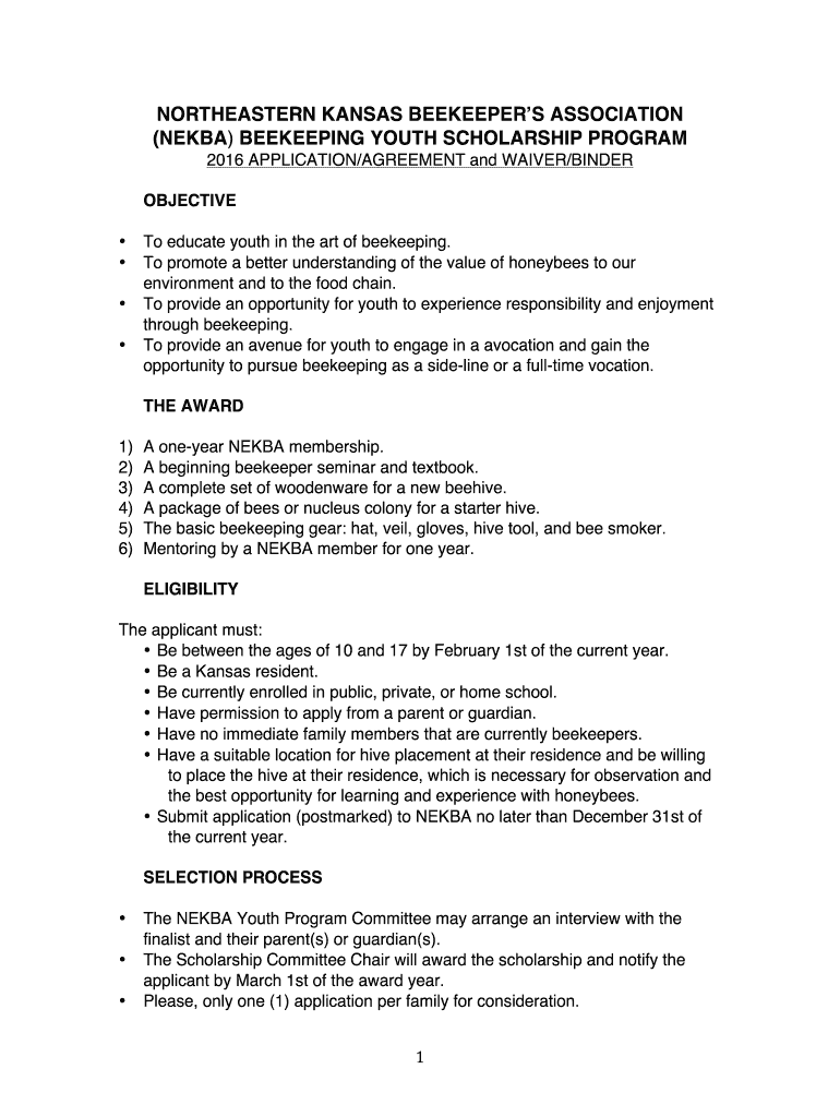NORTHEASTERN KANSAS BEEKEEPERS ASSOCIATION (NE KBA) BEEKEEPING YOUTH SCHOLARSHIP PROGRAM 2016 APPLICATION/AGREEMENT and WAIVER/BINDER OBJECTIVE To educate youth in the art of beekeeping. To promote