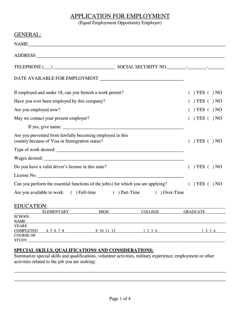 APPLICATION FOR EMPLOYMENT (Equal Employment Opportunity Employer)GENERAL: NAME ADDRESS TELEPHONE () SOCIAL SECURITY NO. DATE AVAILABLE FOR EMPLOYMENT If employed and under 18, can you furnish a work