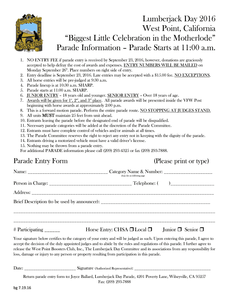 Lumberjack Day 2016 West Point, California Biggest Little Celebration in the Mother lode Parade Information Parade Starts at 11:00 a.m. 1. NO ENTRY FEE if parade entry is received by September 23,