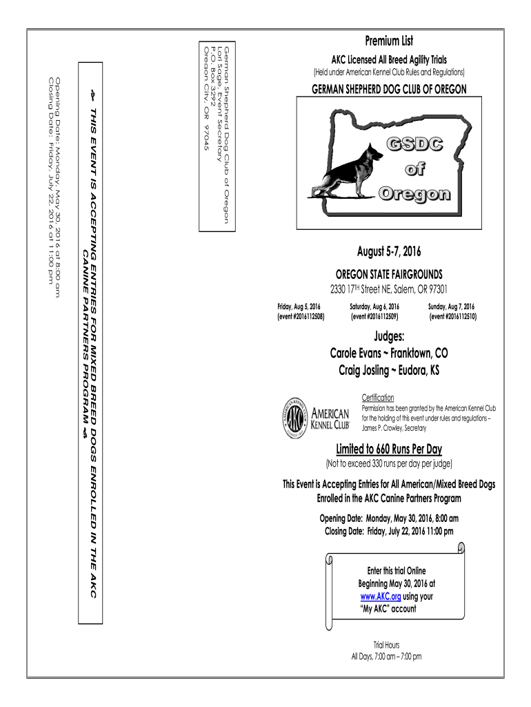THIS EVENT IS ACCEPTING ENTRIES FOR MIXED BREED DOGS ENROLLED IN THE AKC CANINE PARTNERS PROGRAM Opening Date: Monday, May 30, 2016, at 8:00 am Closing Date: Friday, July 22, 2016, at 11:00 pm German