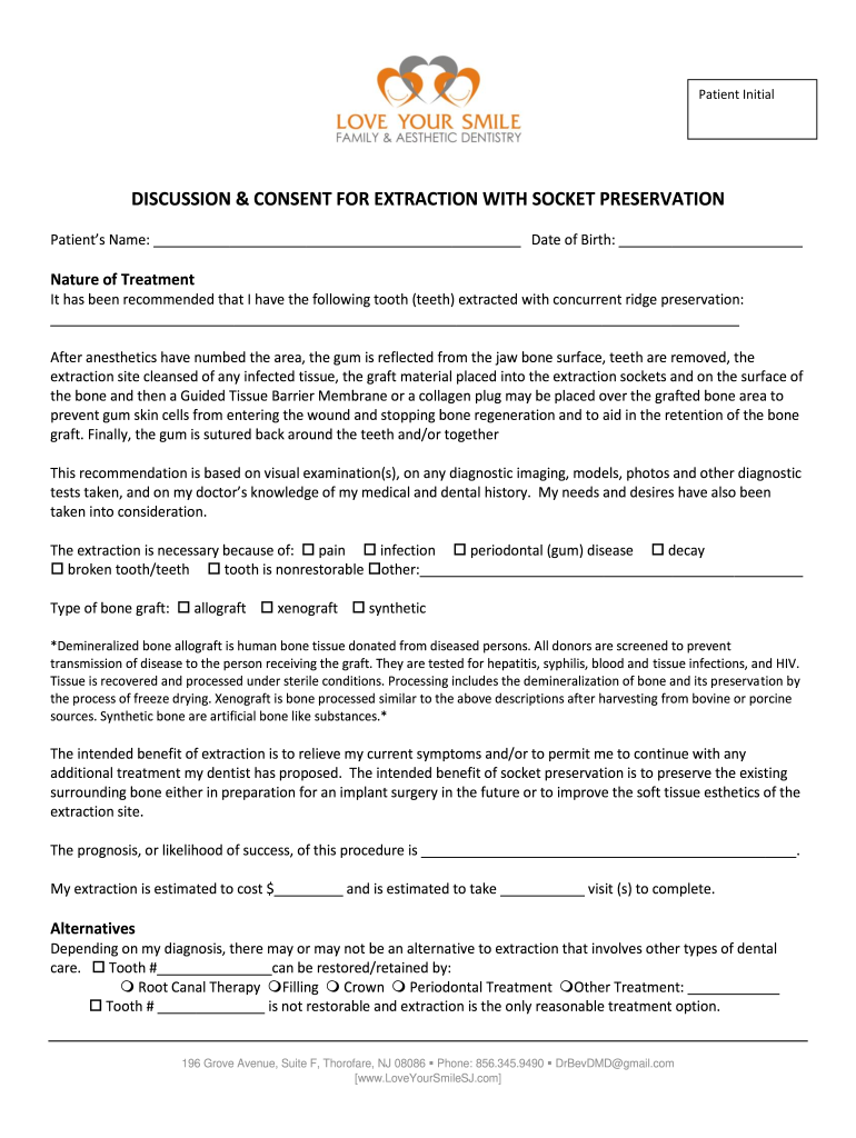 Patient InitialDISCUSSION & CONSENT FOR EXTRACTION WITH SOCKET PRESERVATION Patients Name: Date of Birth: Nature of Treatment It has been recommended that I have the following tooth (teeth) extracted