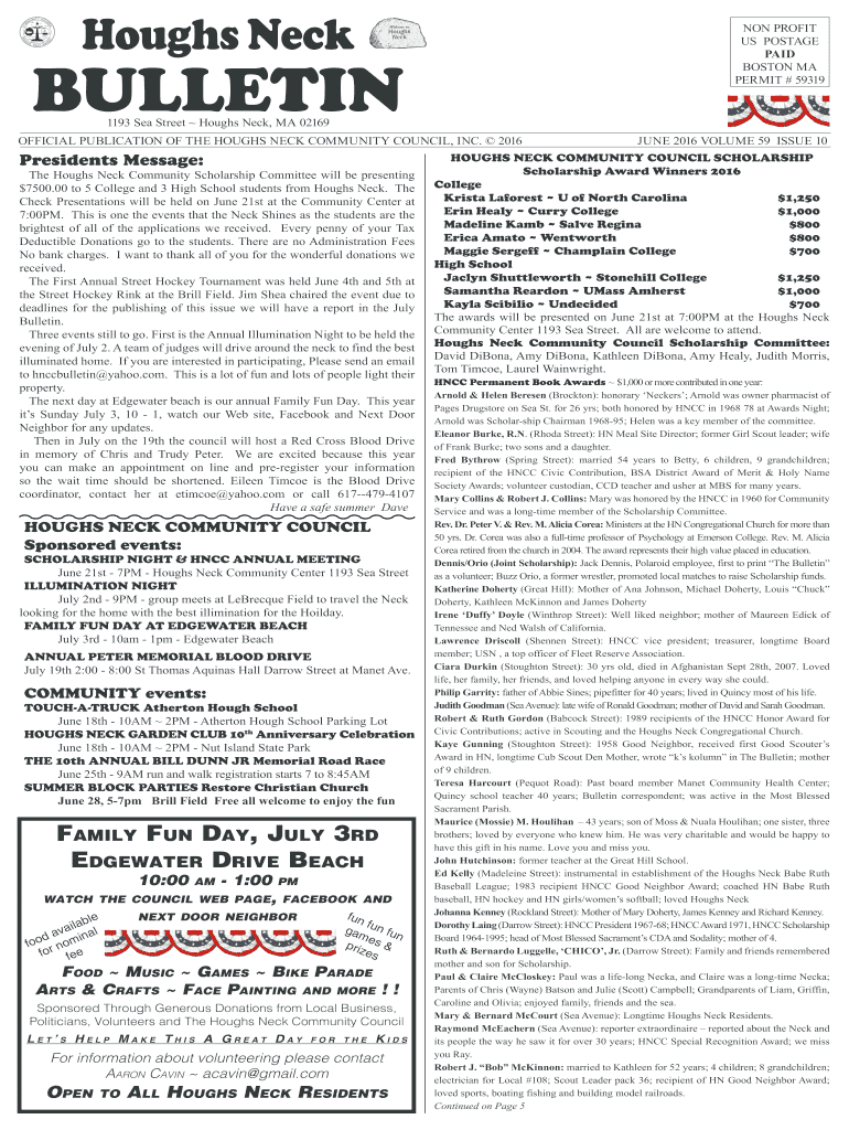 Coughs NeckBULLETINThe COUGHS NECK BULLETIN June 2016 NON PROFIT US POSTAGE PAID BOSTON MA PERMIT # 593191193 Sea Street Coughs Neck, MA 02169OFFICIAL PUBLICATION OF THE COUGHS NECK COMMUNITY COUNCIL,