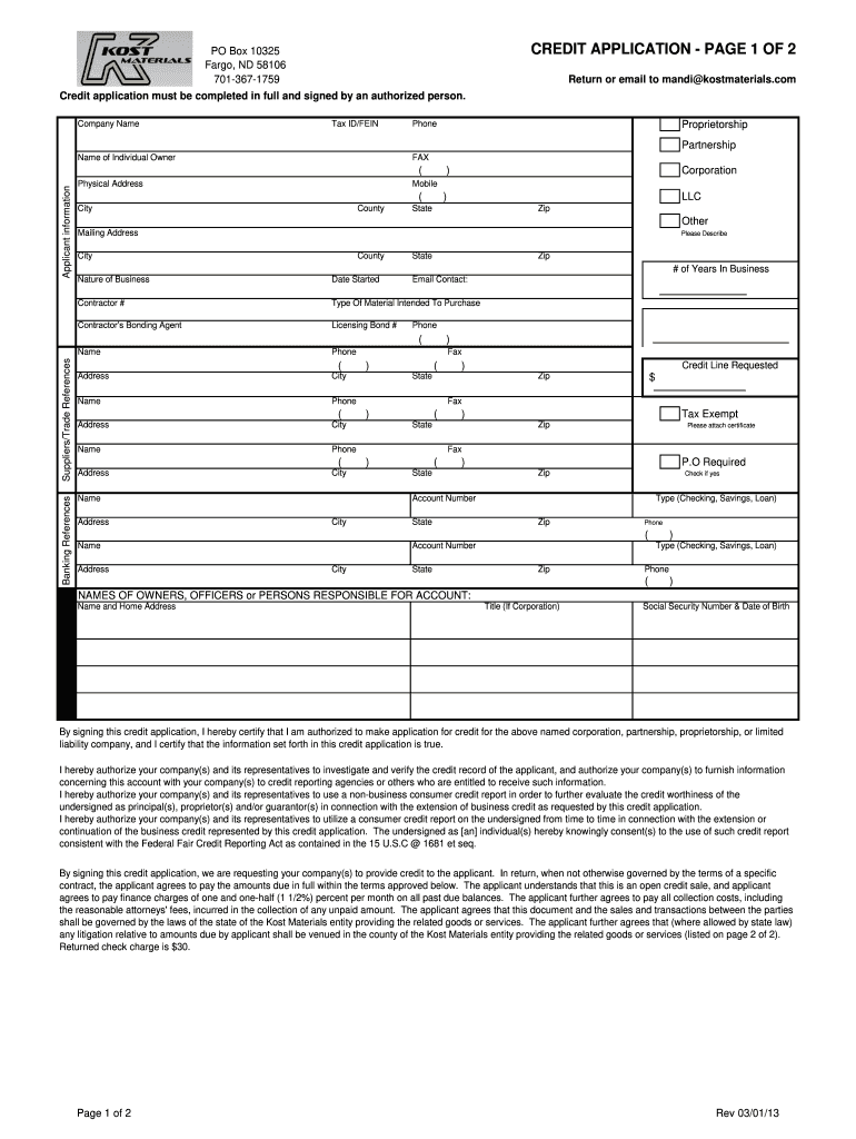 CREDIT APPLICATION PAGE 1 OF 2PO Box 10325 Fargo, ND 58106 7013671759Return or email to Mandy kostmaterials.noncredit application must be completed in full and signed by an authorized person. Company