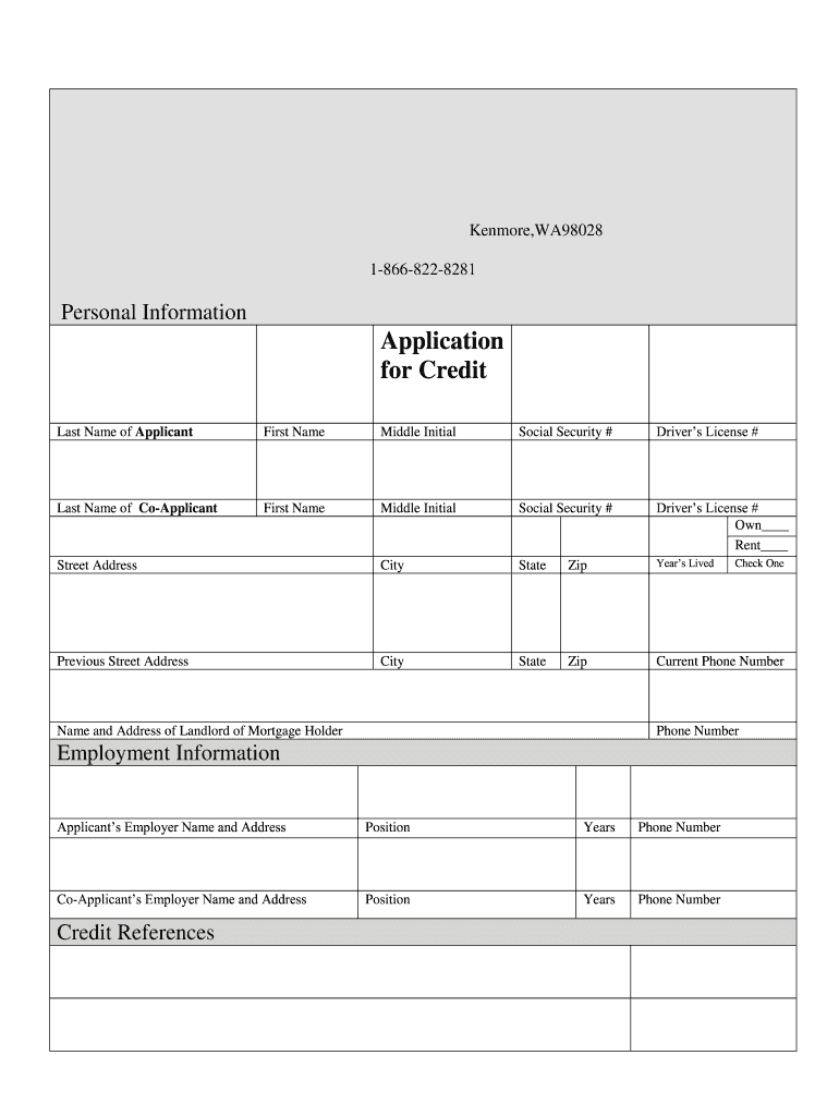 Kenmore,WA98028 18668228281Personal InformationApplication for Credit Last Name of ApplicantFirst NameMiddle InitialSocial Security #Driver's License #Last Name of CoApplicantFirst NameMiddle InitialSocial