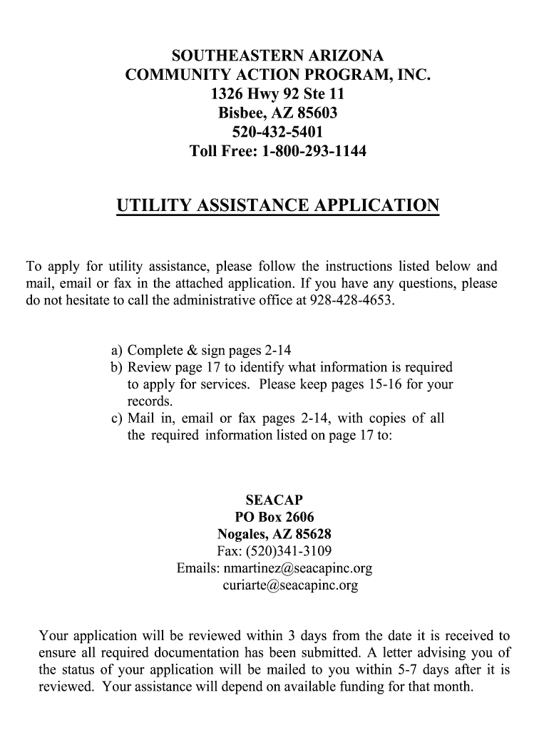 SOUTHEASTERN ARIZONA COMMUNITY ACTION PROGRAM, INC. 1326 Hwy 92 Ste 11 Bisbee, AZ 85603 5204325401 Toll Free: 18002931144UTILITY ASSISTANCE APPLICATION To apply for utility assistance, please follow