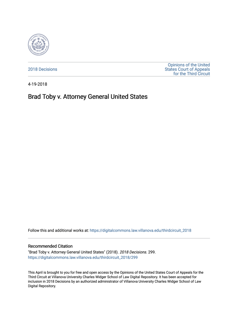 2018 DecisionsOpinions of the United States Court of Appeals for the Third Circuit4192018Brad Toby v. Attorney General United StatesFollow this and additional works at: https://digitalcommons.law.villanova.edu/thirdcircuit
