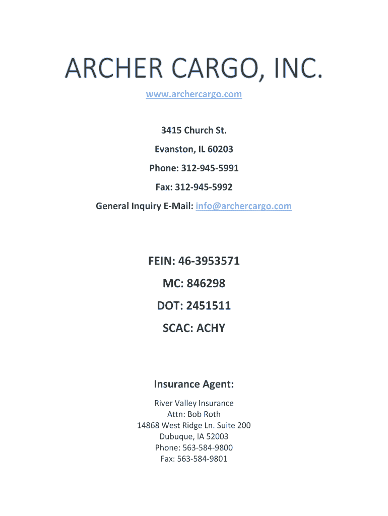 General Inquiry Email: info@archercargo.comFEIN: 463953571
