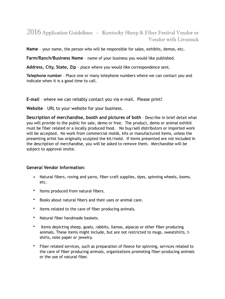 2016 Application Guidelines Kentucky Sheep & Fiber Festival Vendor or Vendor with LivestockName your name, the person who will be responsible for sales, exhibits, demos, etc. Farm/Ranch/Business Name