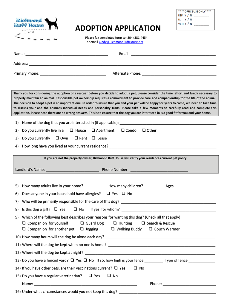 ADOPTION APPLICATION Please fax completed form to (804) 3814454 or email Cindy RichmondRuffHouse.ornate: Email: Address: Primary Phone: Alternate Phone: Thank you for considering the adoption of a