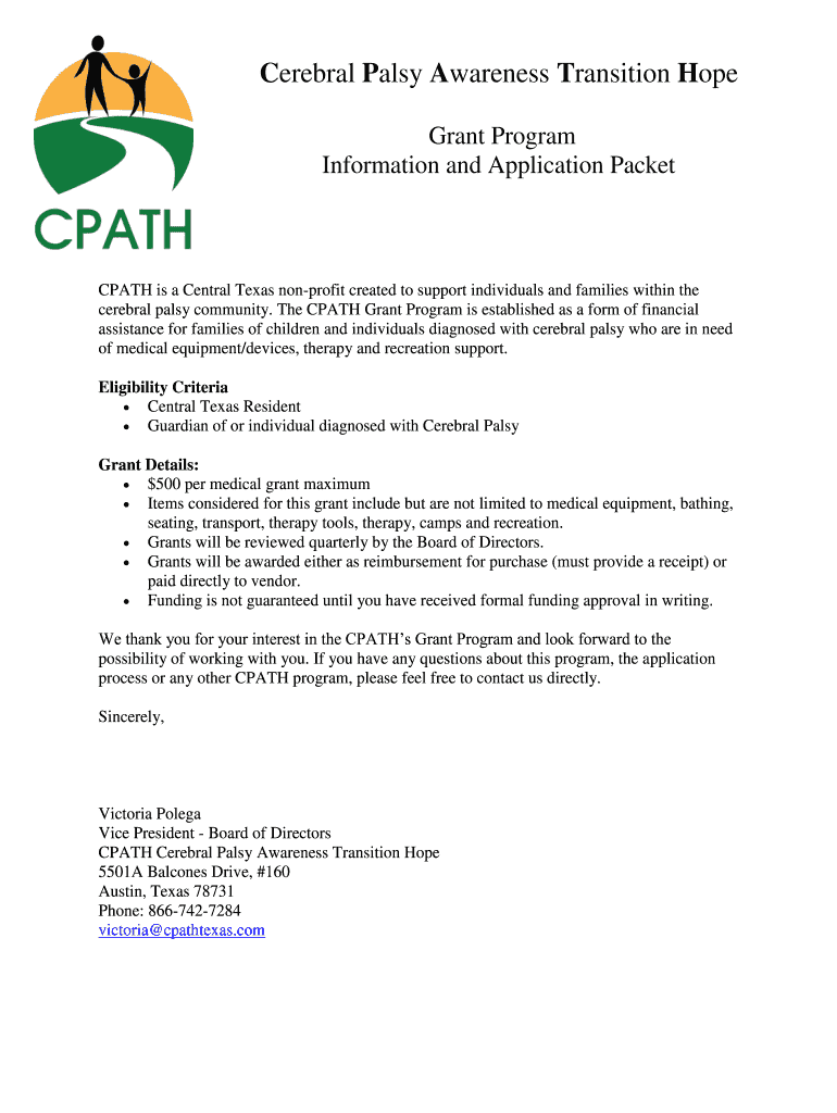 Cerebral Palsy Awareness Transition Hope Grant Program Information and Application PacketCPATH is a Central Texas nonprofit created to support individuals and families within the cerebral palsy community.