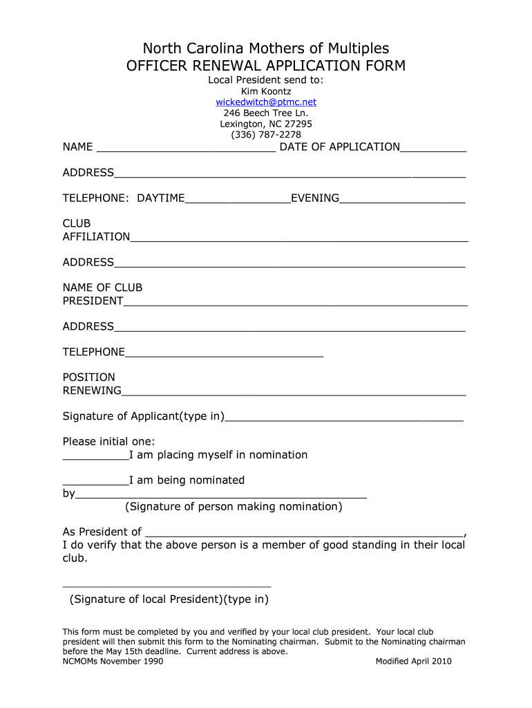 North Carolina Mothers of Multiples OFFICER RENEWAL APPLICATION FORM Local President sends to: Kim Koontz wicked witch PTC.net 246 Beech Tree Ln. Lexington, NC 27295 (336) 7872278NAME DATE OF APPLICATION