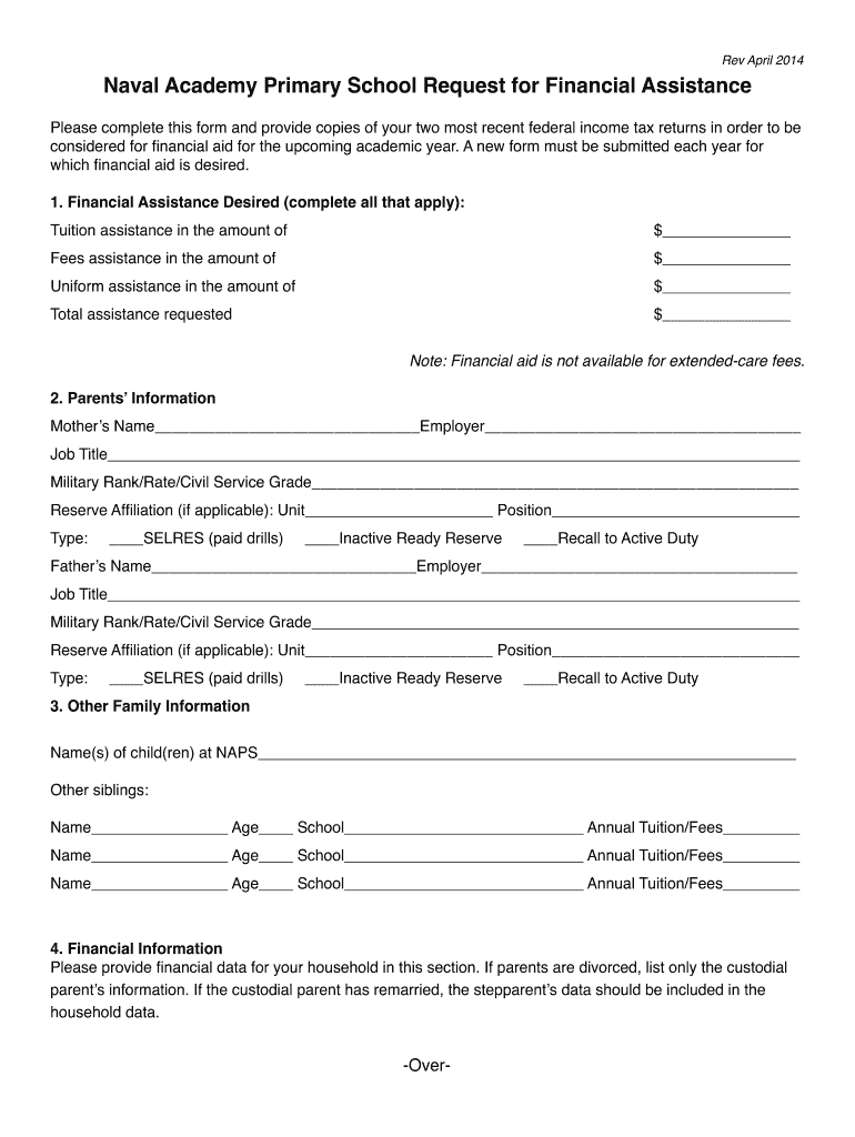 Rev April 2014Naval Academy Primary School Request for Financial Assistance!! Please complete this form and provide copies of your two most recent federal income tax returns in order to be considered