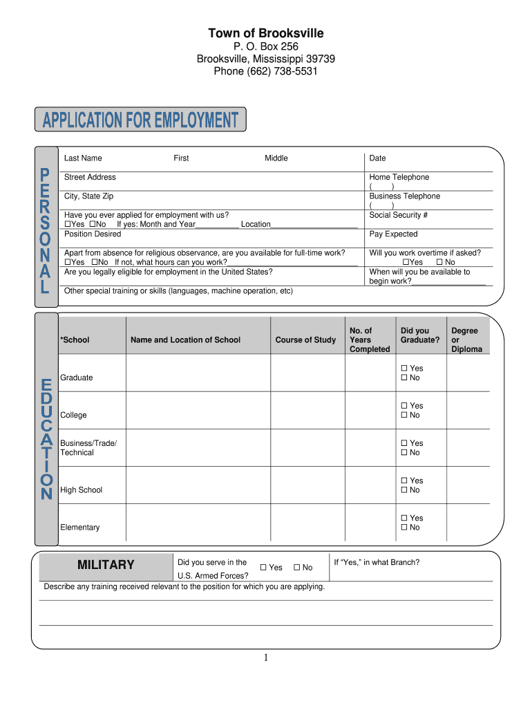 Town of Brookville P. O. Box 256 Brookville, Mississippi 39739 Phone (662) 7385531Last NameFirstMiddleDateStreet Address City, State Zip Have you ever applied for employment with us? Yes No If yes: