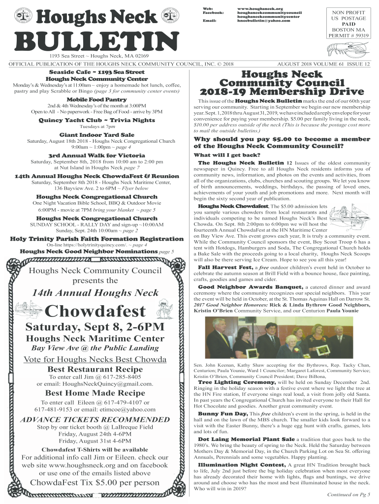 Coughs NeckBULLETINWeb:Facebook:Email:www.houghsneck.org COUGHS NECK BULLETIN AUGUST 2018 houghsneckcommunitycouncilNON PROFIT houghsneckcommunitycenter US POSTAGE hnccbulletin yahoo.com PAID BOSTON