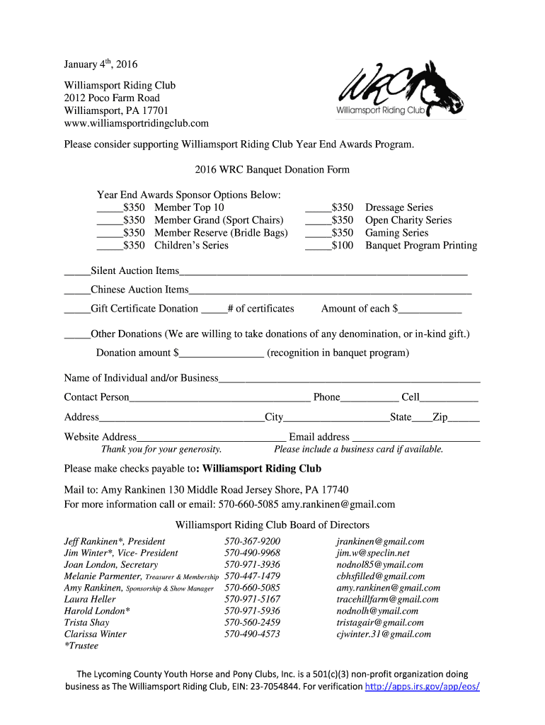 January 4th, 2016 Williamsport Riding Club 2012 Polo Farm Road Williamsport, PA 17701 www.williamsportridingclub.com Please consider supporting Williamsport Riding Club Year End Awards Program. 2016