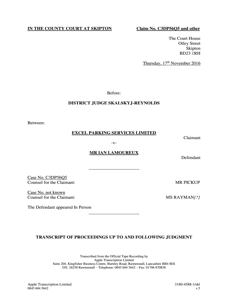 IN THE COUNTY COURT AT SKIPTONClaim No. C3DP56Q5 and other The Court House Motley Street Skip ton BD23 1RH Thursday, 17th November 2016Before: DISTRICT JUDGE SKALSKYJREYNOLDSBetween: EXCEL PARKING