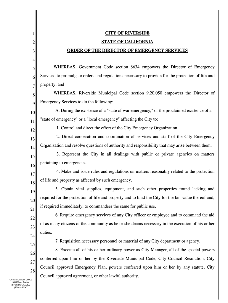 1CITY OF RIVERSIDE2STATE OF CALIFORNIA3ORDER OF THE DIRECTOR OF EMERGENCY SERVICES4 5WHEREAS, Government Code section 8634 empowers the Director of Emergency6Services to promulgate orders and regulations