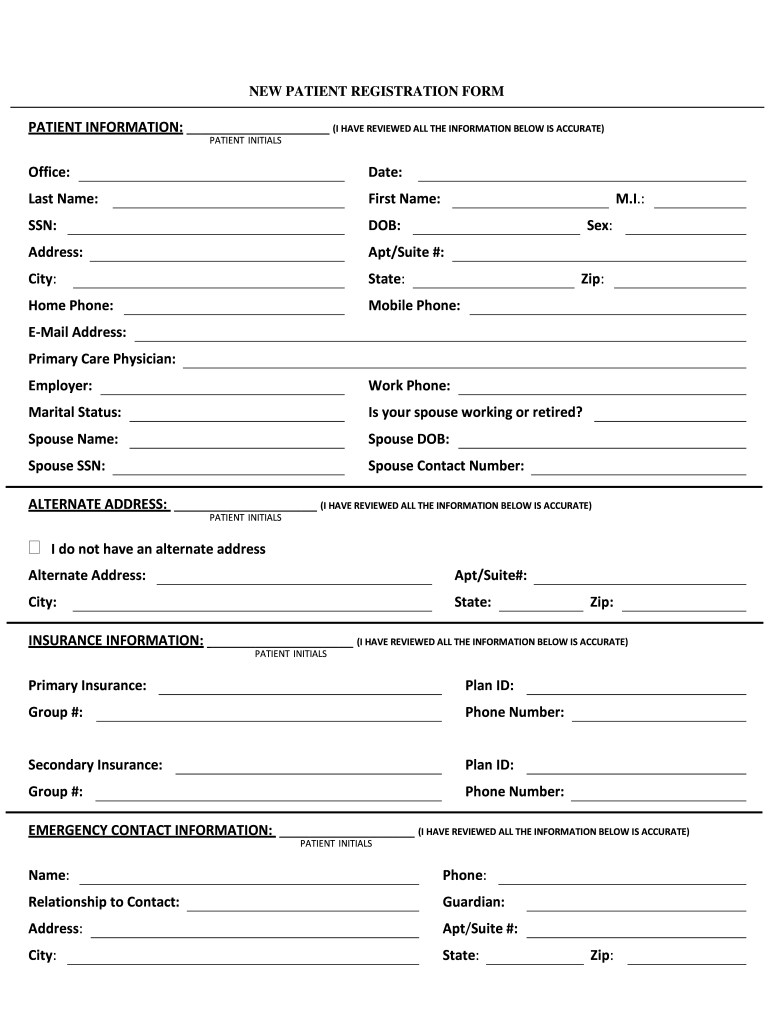 NEW PATIENT REGISTRATION FORMATION INFORMATION: (I HAVE REVIEWED ALL THE INFORMATION BELOW IS ACCURATE) PATIENT INITIALSOffice:Date:Last Name:First Name:SSN:DOB:Address:Apt/Suite #:City:State:Home