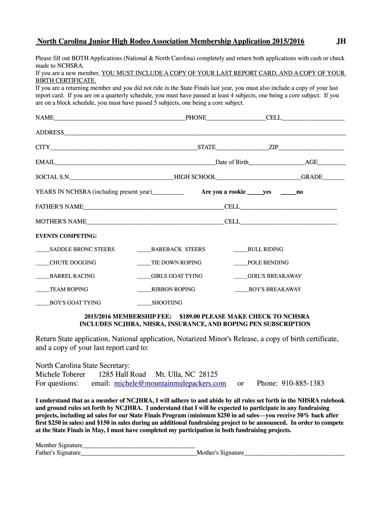 North Carolina Junior High Rodeo Association Membership Application 2015/2016JHPlease fill out BOTH Applications (National & North Carolina) completely and return both applications with cash or check