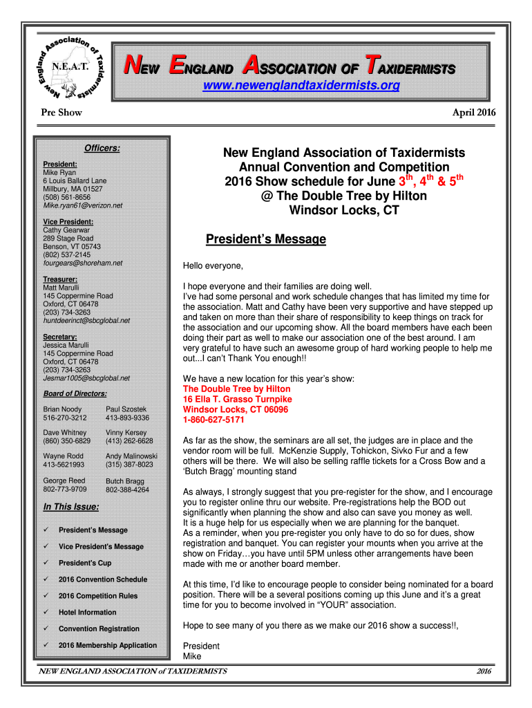 NEE WW ENNGGLLAANNDD ASSSSOOCCIIAATTIIOONN OFF TAAXXIIDDEERRMMIISSTTSS www.newenglandtaxidermists.org PRE Show April 2016 Officers:New England Association of Taxidermists Annual Convention and Competition