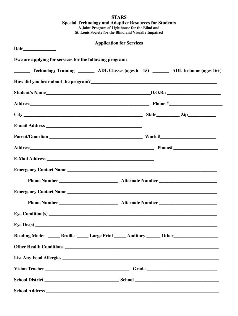 STARS Special Technology and Adaptive Resources for Students A Joint Program of Lighthouse for the Blind and St. Louis Society for the Blind and Visually ImpairedApplication for Services Date I/we