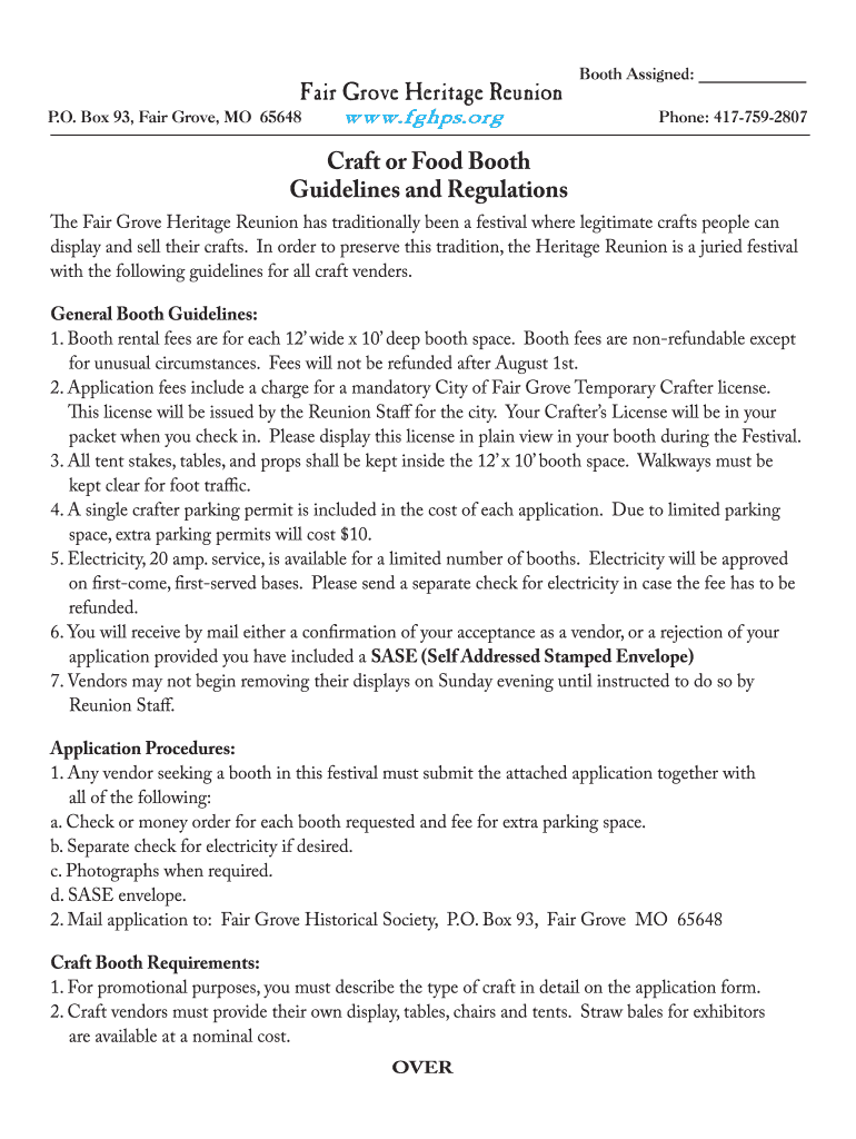 Fair Grove Heritage Reunion P.O. Box 93, Fair Grove, MO 65648www.fights.org Booth Assigned: Phone: 4177592807Craft or Food Booth Guidelines and Regulations The Fair Grove Heritage Reunion has traditionally