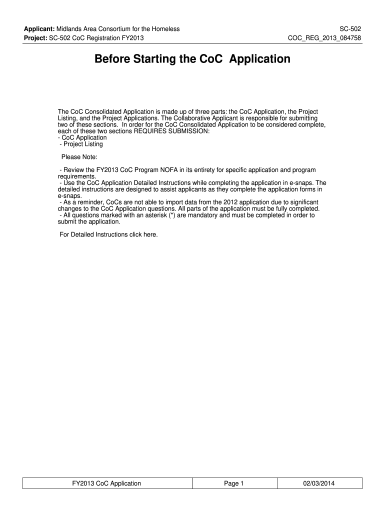 Applicant: Midlands Area Consortium for the Homeless Project: SC502 COC Registration FY2013SC502 COC REG 2013 084758Before Starting the COC Application COC Consolidated Application is made up of three
