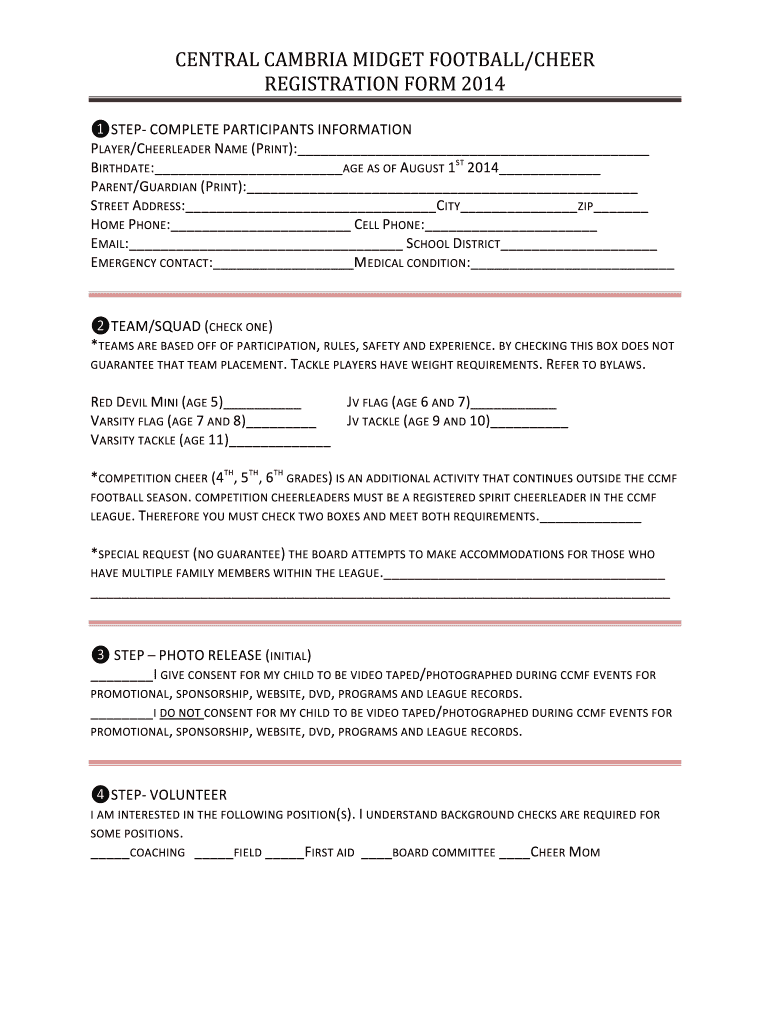 CENTRAL CAMBRIA MIDGET FOOTBALL/CHEER REGISTRATION FORM 2014 STEP COMPLETE PARTICIPANTS INFORMATION PLAYER/CHEERLEADER NAME (PRINT): BIRTHDATE: AGE AS OF AUGUST 1ST 2014 PARENT/GUARDIAN (PRINT): STREET