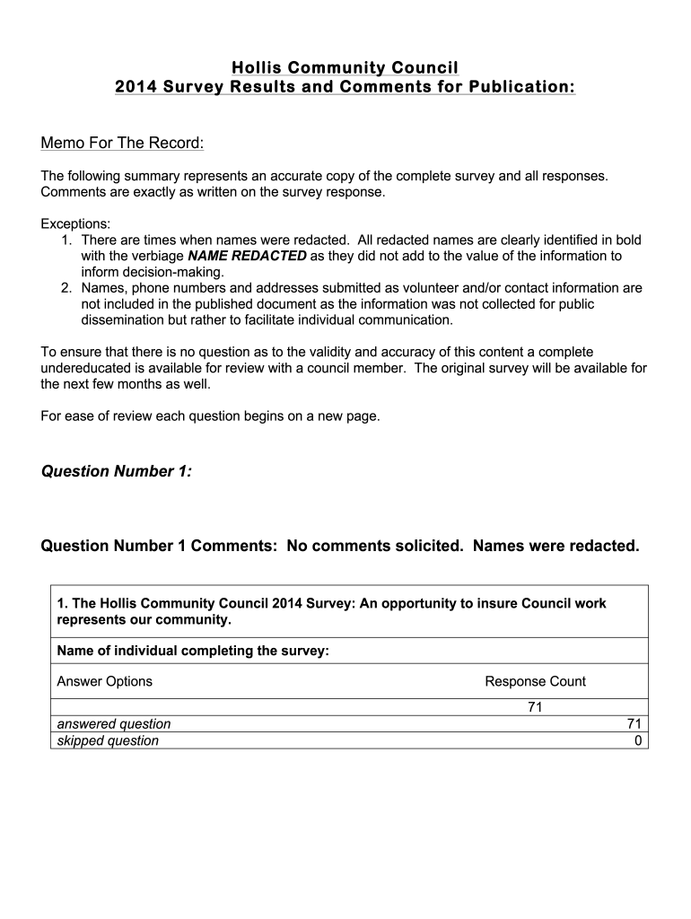Get the free The Hollis Community Council 2014 Survey Summary With Comments REDACTED