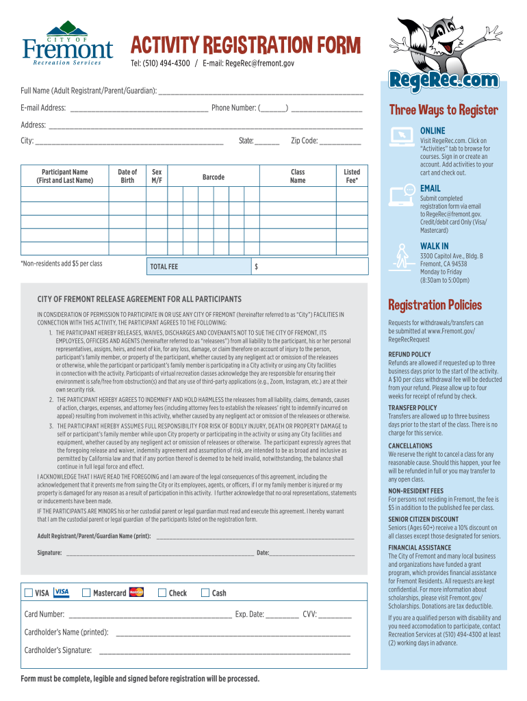 ACTIVITY REGISTRATION FORM Tel: (510) 4944300 / Email: Referee Fremont. Godfall Name (Adult Registrant/Parent/Guardian): Email Address: Phone Number: () Address: City: Participant Name (First and