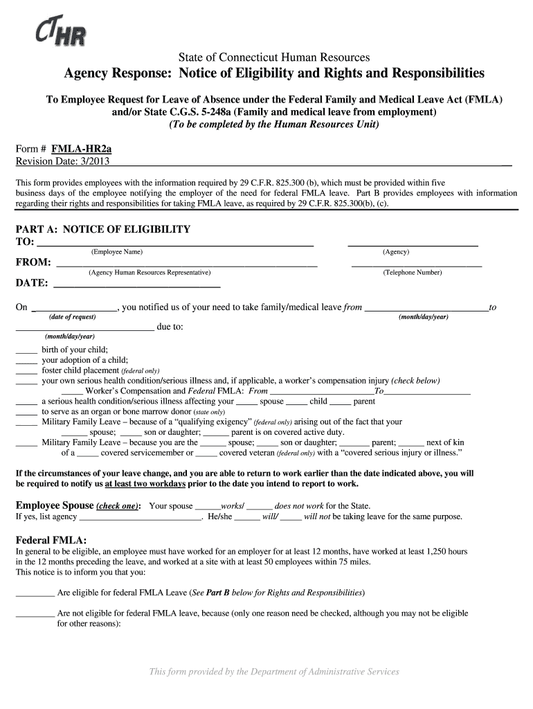 State of Connecticut Human ResourcesAgency Response: Notice of Eligibility and Rights and Responsibilities To Employee Request for Leave of Absence under the Federal Family and Medical Leave Act (FMLA)