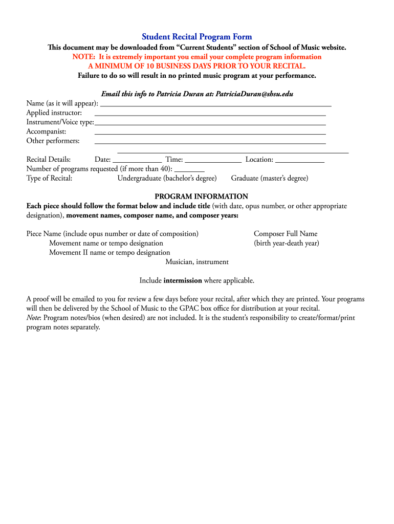 Student Recital Program Form This document may be downloaded from Current Students section of School of Music website. NOTE: It is extremely important you email your complete program information A
