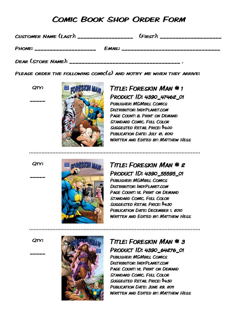 Comic Book Shop Order Form Customer Name (Last): Phone: (First): Email: Dear (Store Name):, Please order the following comic(s) and notify me when they arrive: Qty:Title: Foreskin Man # 1 Product