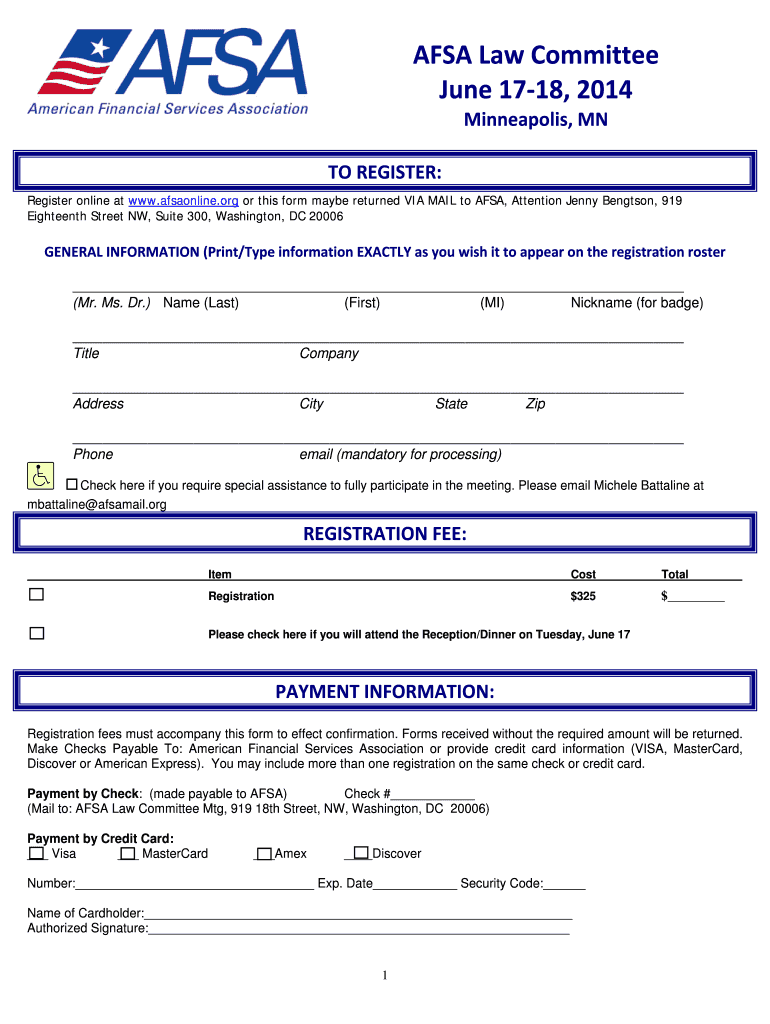 FSA Law Committee June 17?18, 2014 Minneapolis, MN TO REGISTER: Register online at www.afsaonline.org or this form maybe returned VIA MAIL to FSA, Attention Jenny Benson, 919 Eighteenth Street NW,