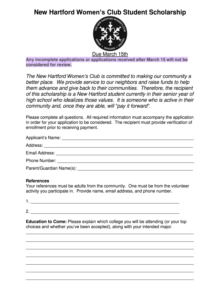 New Hartford Women's Club Student Scholarship March 15th