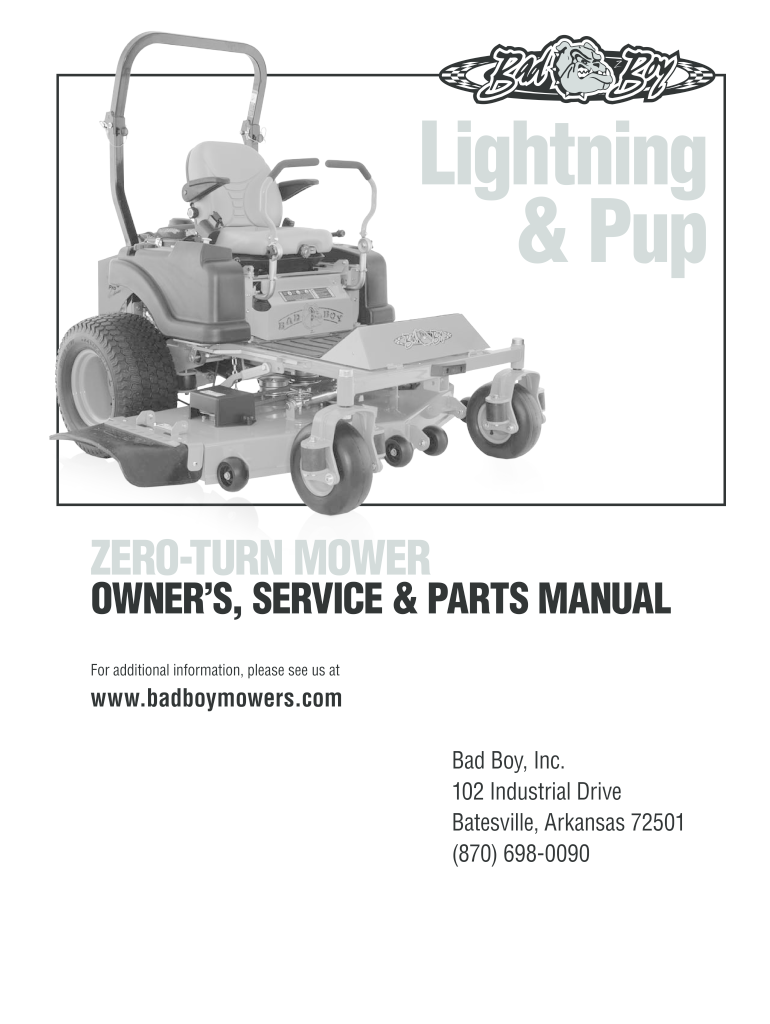 Lightning & PupZEROTURN HOMEOWNERS, SERVICE & PARTS MANUAL For additional information, please see us ATGW.badboymowers.combat Boy, Inc.102 Industrial DriveBatesville, Arkansas 72501(870) 6980090TABLE