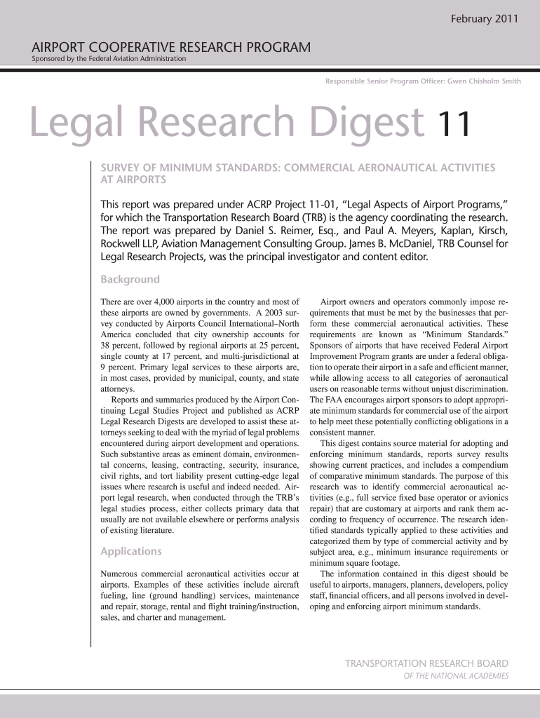 Sponsored by the Federal Aviation AdministrationResponsible Senior Program Officer: Gwen Chisholm SmithLegal Research Digest 11