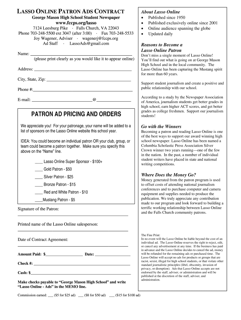 LASSO ONLINE PATRON ADS CONTRACT George Mason High School Student Newspaper www.fccps.org/lasso 7124 Leesburg Pike Falls Church, VA 22043 Phone 703-248-5500 ext 3047 (after 3:00) Fax 703-248-5533