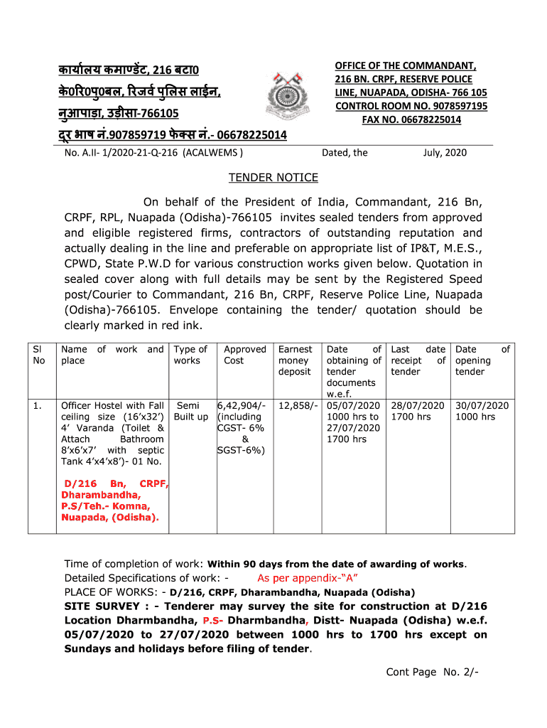 , 216 0000, ,, 766105 .907859719. 06678225014 No. A.II 1/202021Q216 (ACADEMY)OFFICE OF THE COMMANDANT, 216 IN. RPF, RESERVE POLICE LINE, CANADA, ODISHA 766 105 CONTROL ROOM NO. 9078597195 FAX NO.