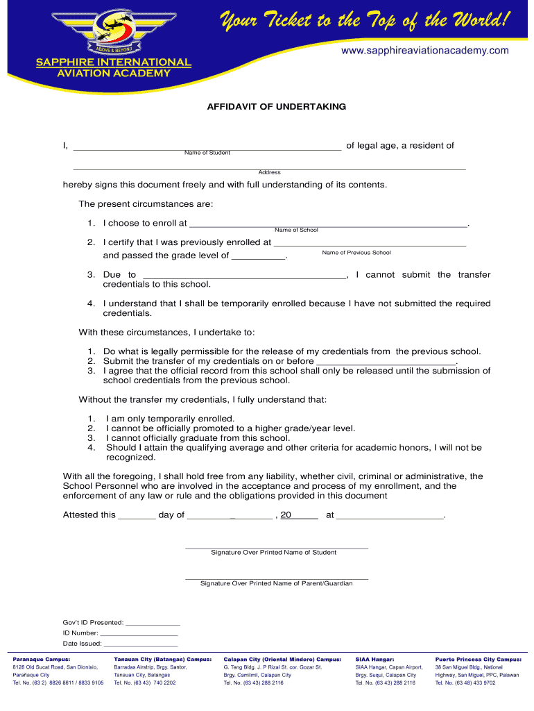 AFFIDAVIT OF UNDERTAKING, of legal age, a resident of Name of StudentAddresshereby signs this document freely and with full understanding of its contents. The present circumstances are: 1. I choose
