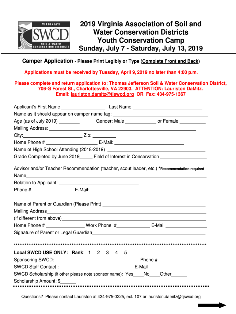 2019 Virginia Association of Soil and Water Conservation Districts Youth Conservation Camp Sunday, July 7 Saturday, July 13, 2019, Camper Application Please Print Legibly or Type (Complete Front and