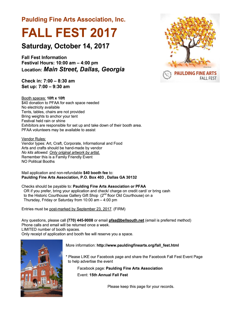 Pauling Fine Arts Association, Inc. FALL FEST 2017 Saturday, October 14, 2017, Fall Fest Information Festival Hours: 10:00 am 4:00 pm Location: Main Street, Dallas, GeorgiaCheck in: 7:00 8:30 am Set