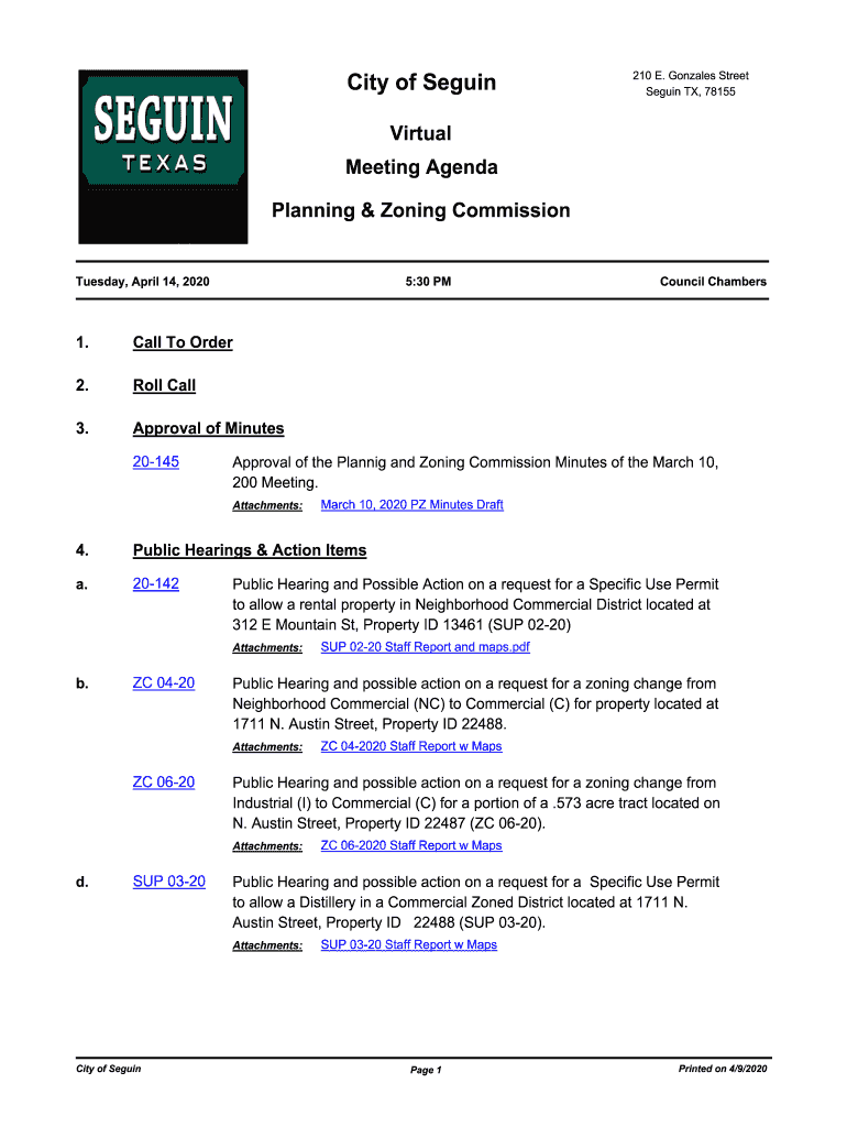 City of Seguin210 E. Gonzales Street Seguin TX, 78155Virtual Meeting Agenda Planning & Zoning Commission Tuesday, April 14, 20205:30 PM1. Call To Order2. Roll Call3. Approval of Minutes 20145Approval