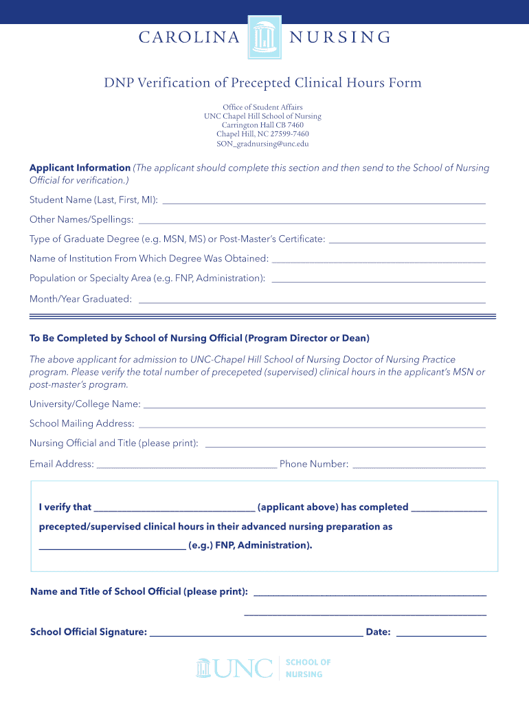 DNP Verification of Precepted Clinical Hours Form Office of Student Affairs UNC Chapel Hill School of Nursing Carrington Hall CB 7460 Chapel Hill, NC 275997460 SON grad nursing UNC.applicant Information