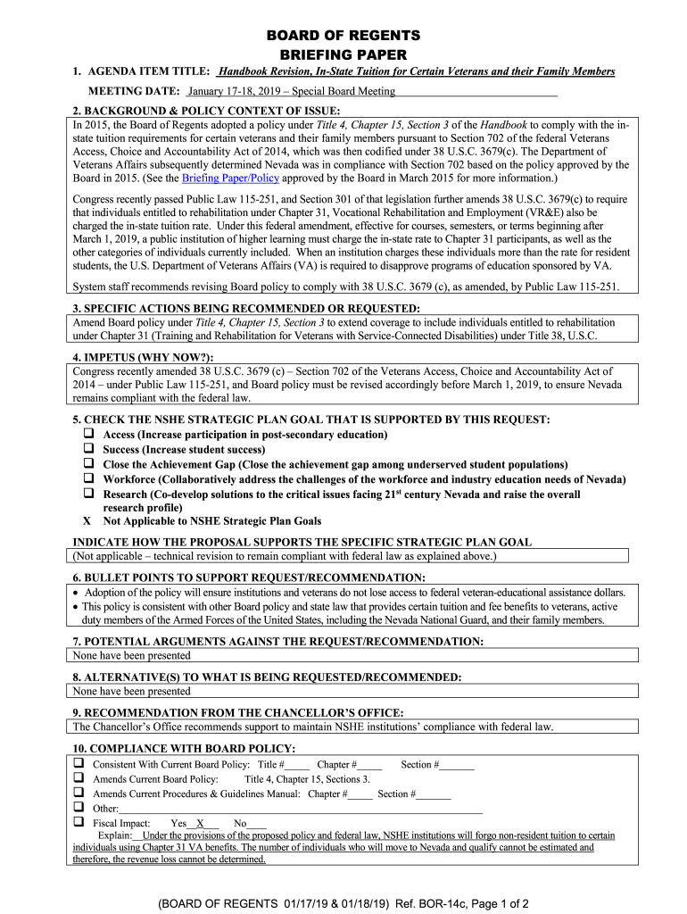 BOARD OF REGENTS BRIEFING PAPER1. AGENDA ITEM TITLE: Handbook Revision, Instate Tuition for Certain Veterans and their Family Members MEETING DATE: January 1718, 2019 Special Board Meeting 2. BACKGROUND